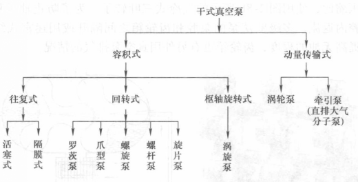 现在市场上提供的干式真空泵种类很多。可分为两类:容积式和动量传输式。容积式无油真空泵,如多级罗茨泵、爪型泵、往复式活塞泵、螺杆式泵和涡旋式泵等。这种干式泵的极限压力一般为0.1~10Pa,抽速为0.01~0.04m3/s。动量传输式的无油真空泵,如涡轮式无油泵。排气侧与大气相接,在连续流状态下压缩比较高。它是一种粗抽泵,可从标准大气压抽到10-2Pa。在结构上采用径向和周向流泵的复合式结构,多级串联取气。这种泵的极限压力约为10-2Pa,抽速为0.02~0.15m3/s。