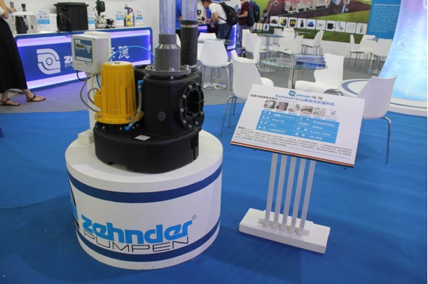 这一处展台从左到右展品分别为泽德SWH190污水提升器、UFB200污水提升器、EPD增压泵、E-ZW 65KS潜污泵,都是家用领域排水泵产品。
